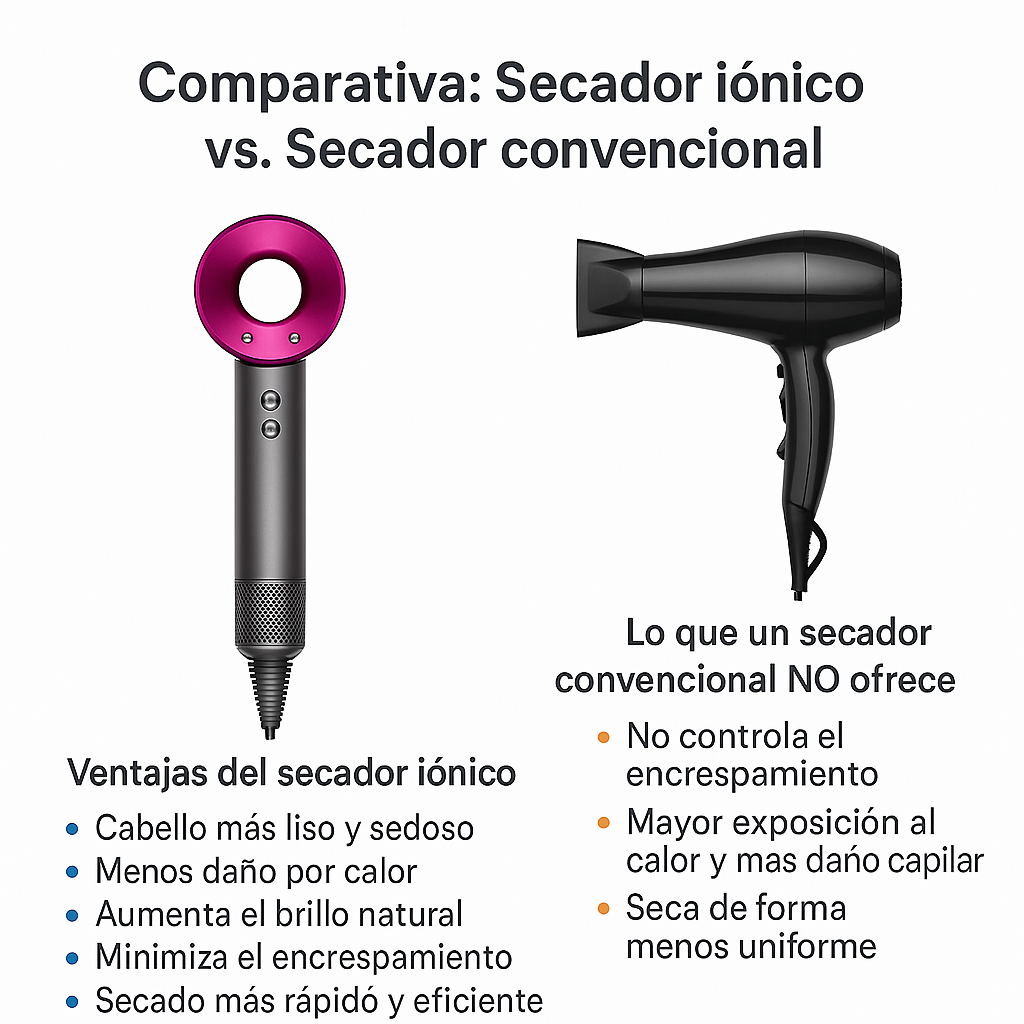 Los secadores iónicos reducen el frizz, dejan el cabello más suave y brillante, y ayudan a mantener la humedad natural del cabello.